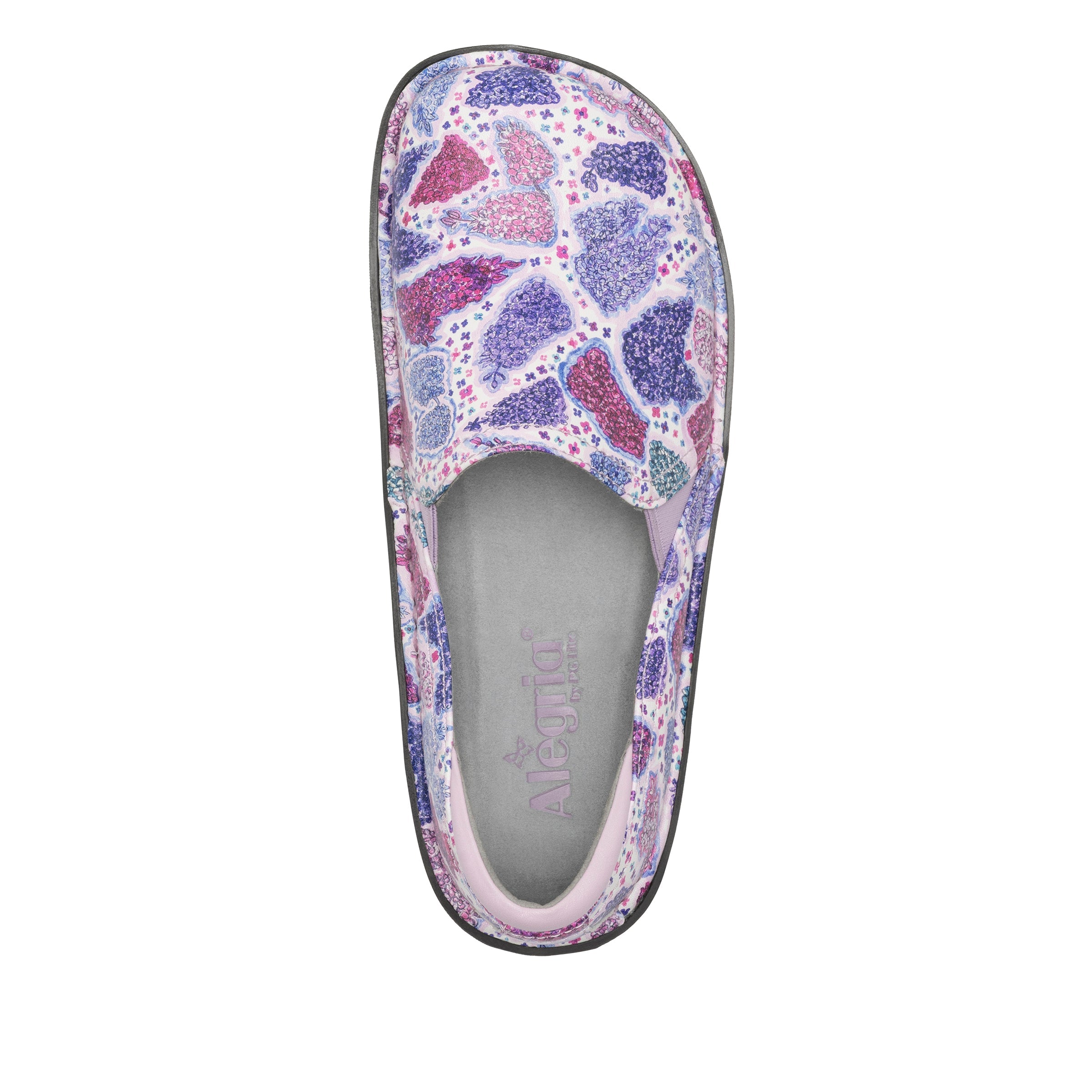Featured in a beautiful hand-drawn Lilac Love design printed on a genuine leather upper.