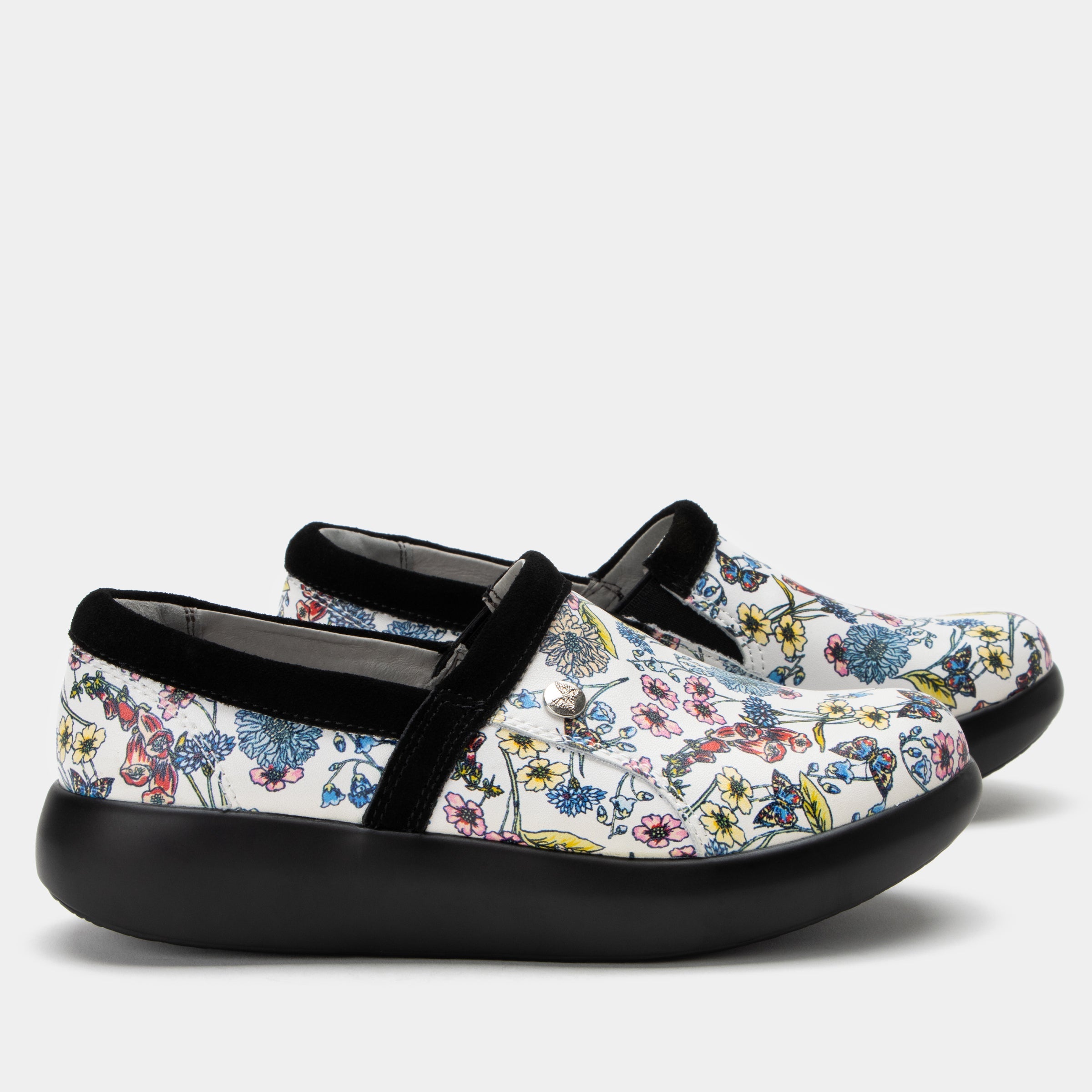 Featured in an a fun Fine and Dandy floral print on genuine leather upper.