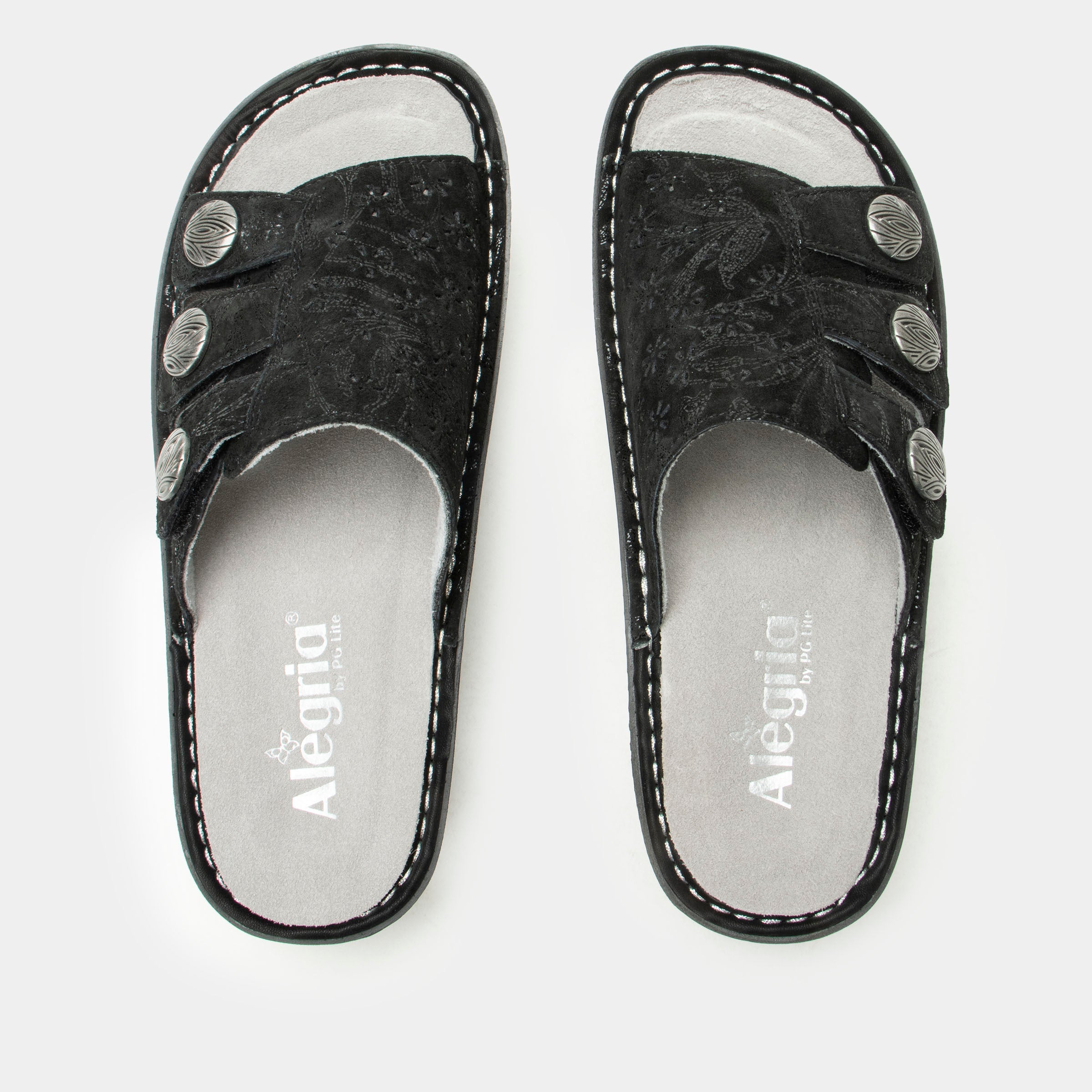 The Julee slide on sandal has a adjustable hook-and-loop closures with a decorative buckle and laser cut details. Sitting on a classic rocker outsole.