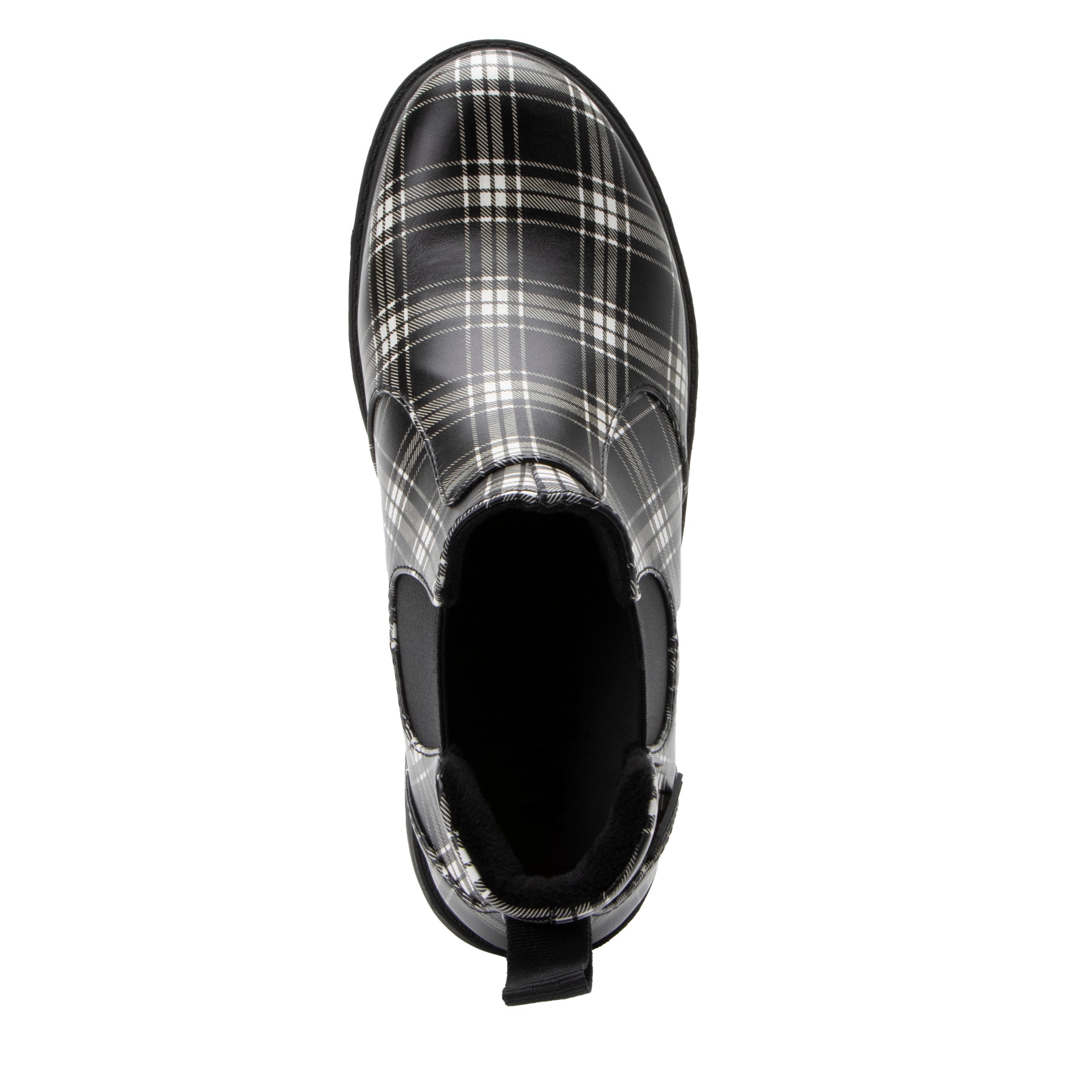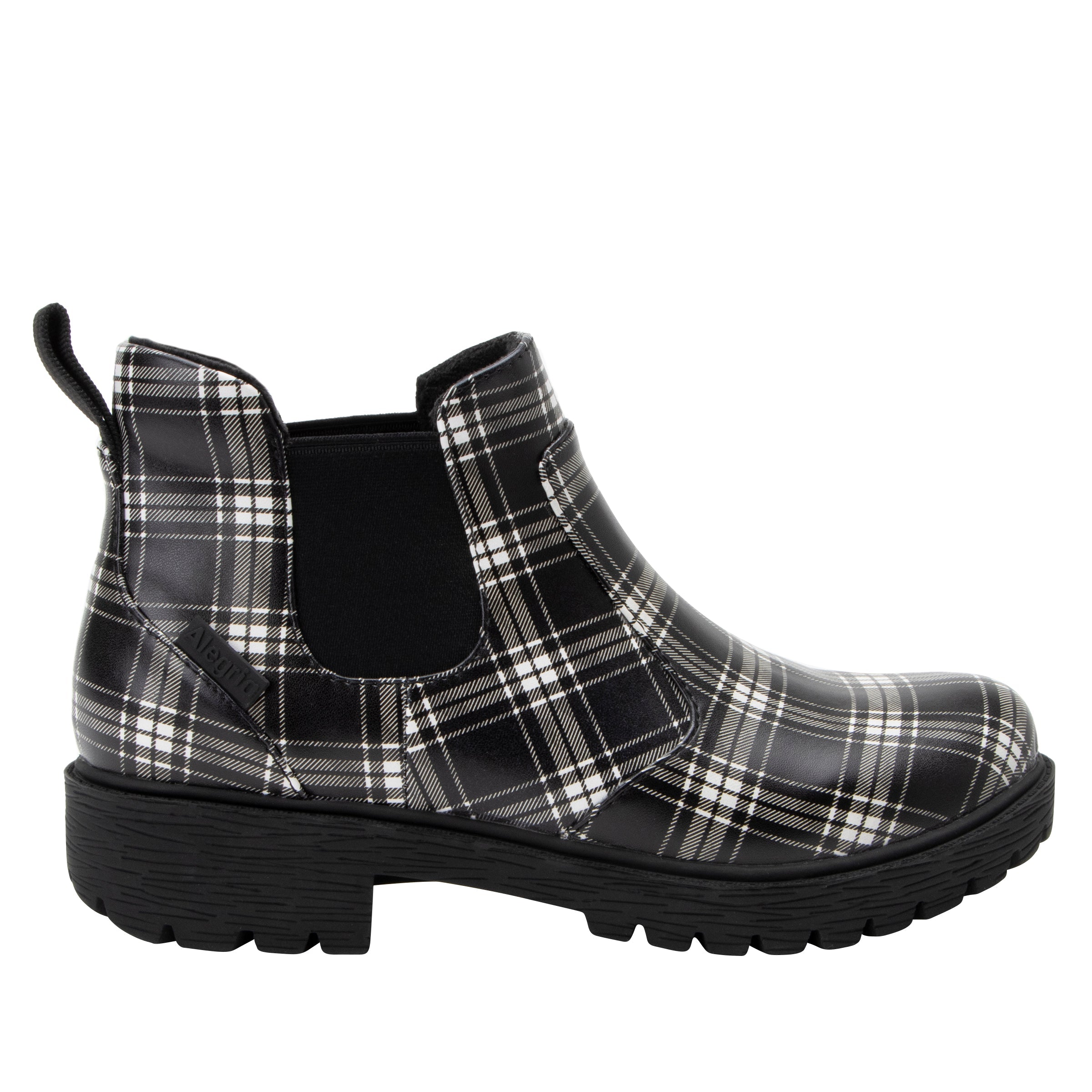 Featured in a Plaid colorway on a vegan leather upper.