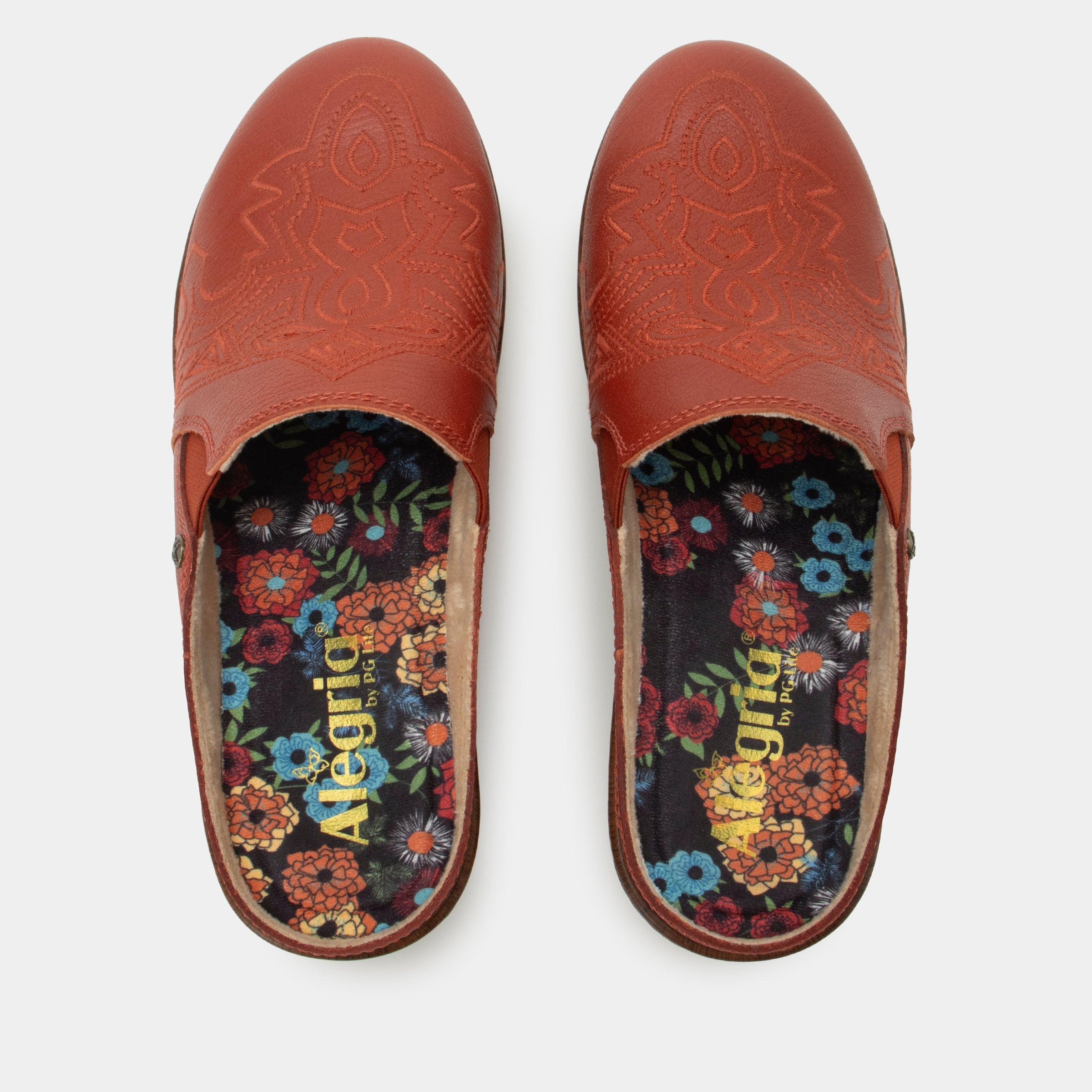 The Sereniti offers the timeless look of a traditional clog, complete with enhanced arch support for all day comfort. The subtle wedge gives added height without pressure on the ball of the foot. Rich supple leather enhances the overall aesthetics, allowing this shoe to transition seamlessly from work to leisure. The removable printed micro suede footbed adds an eye-popping detail.