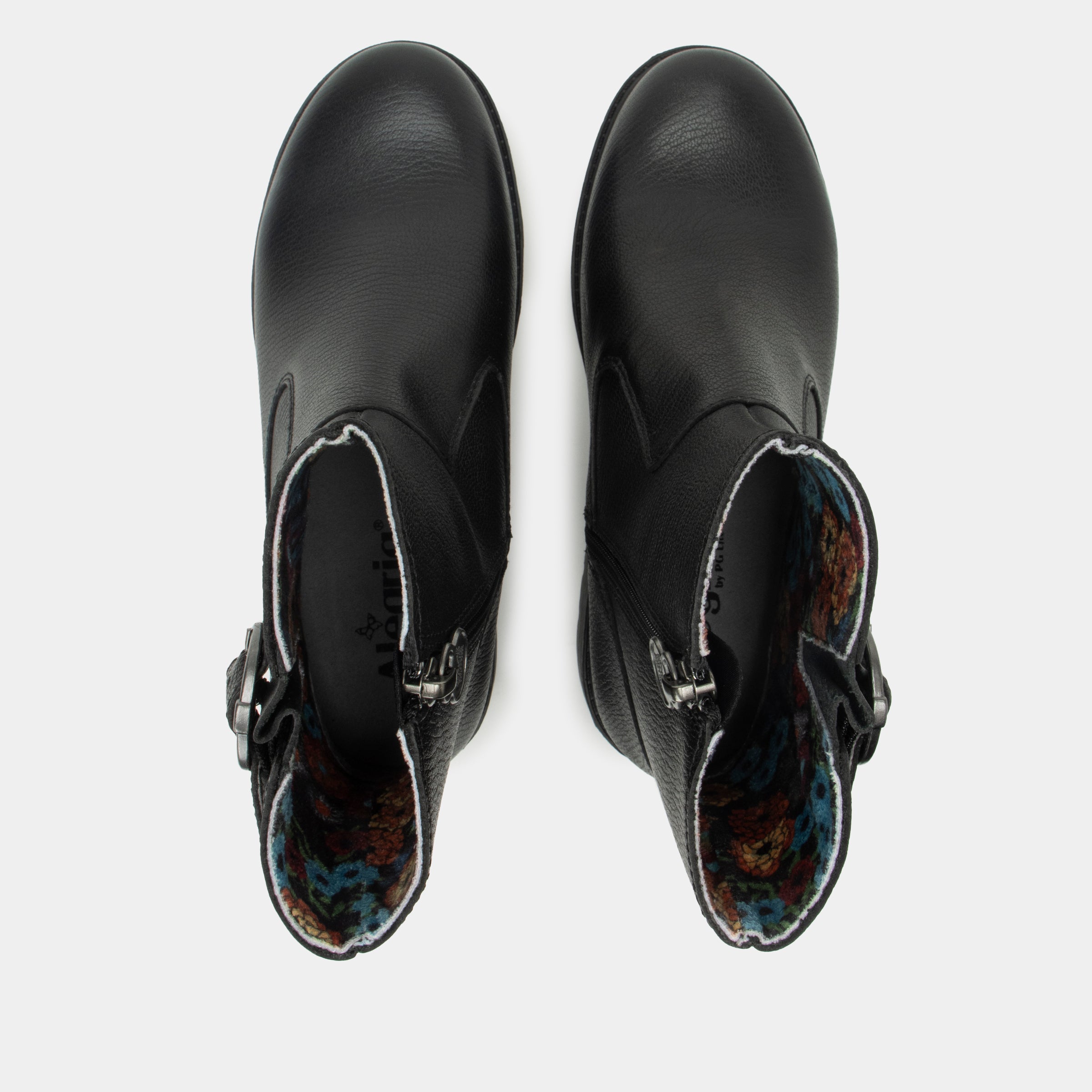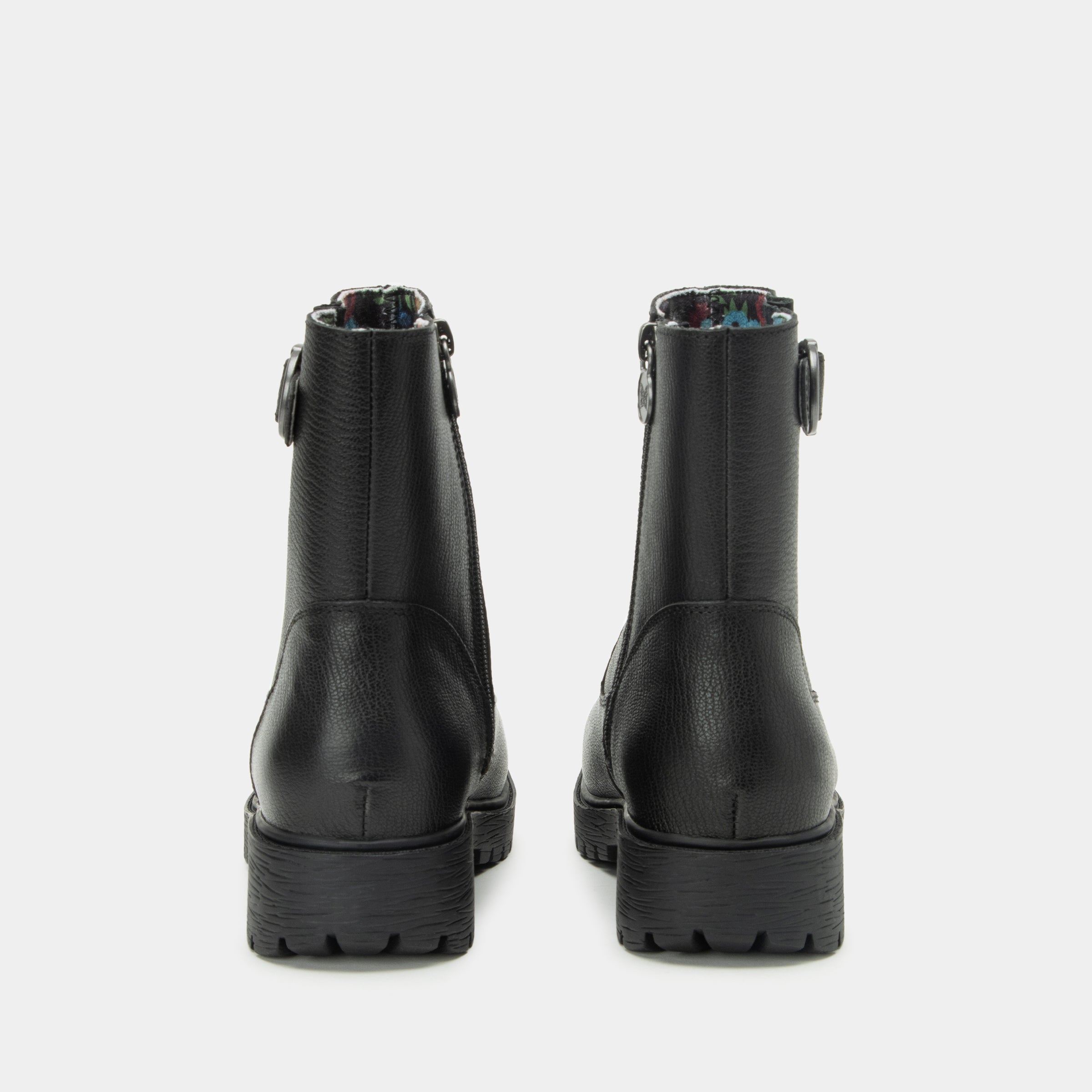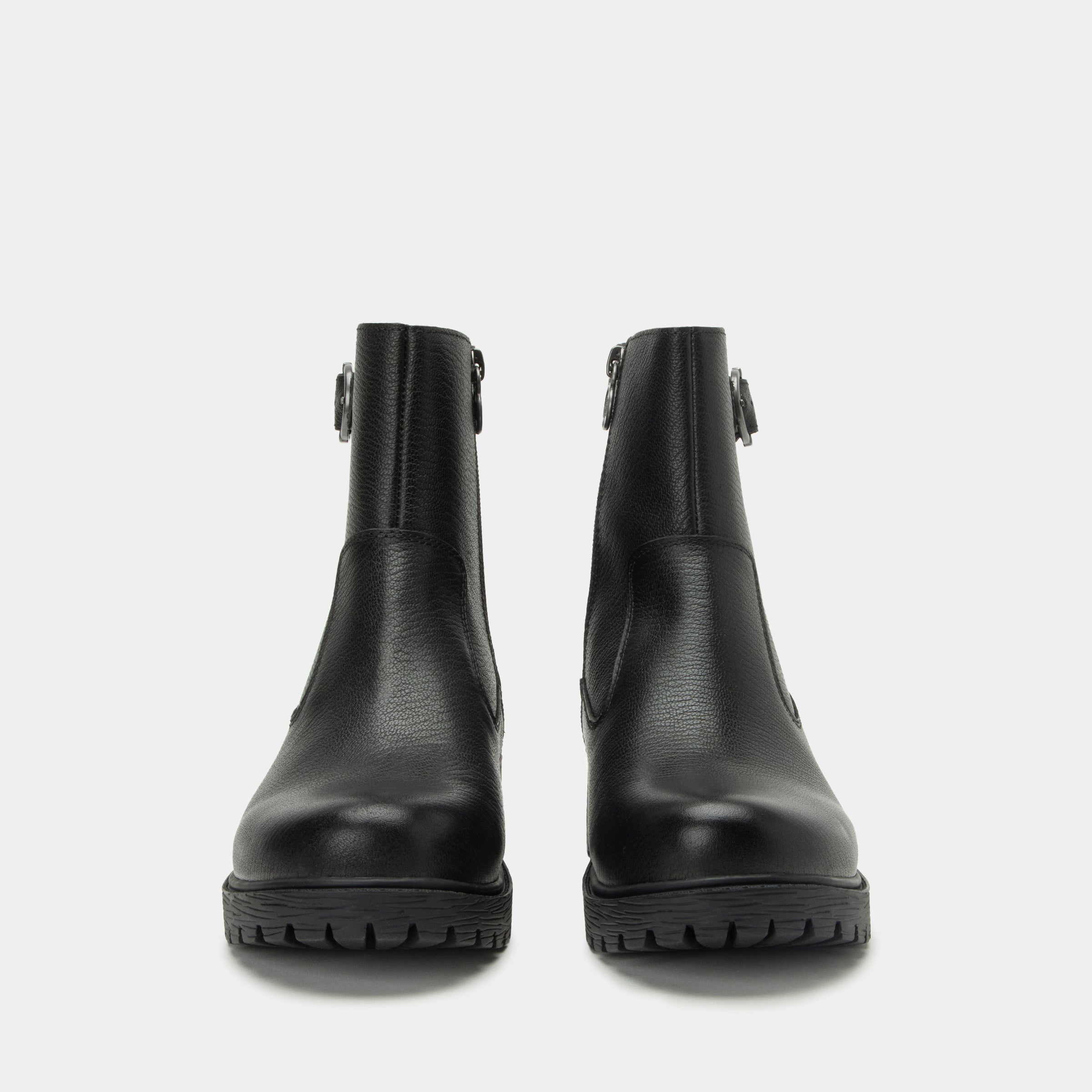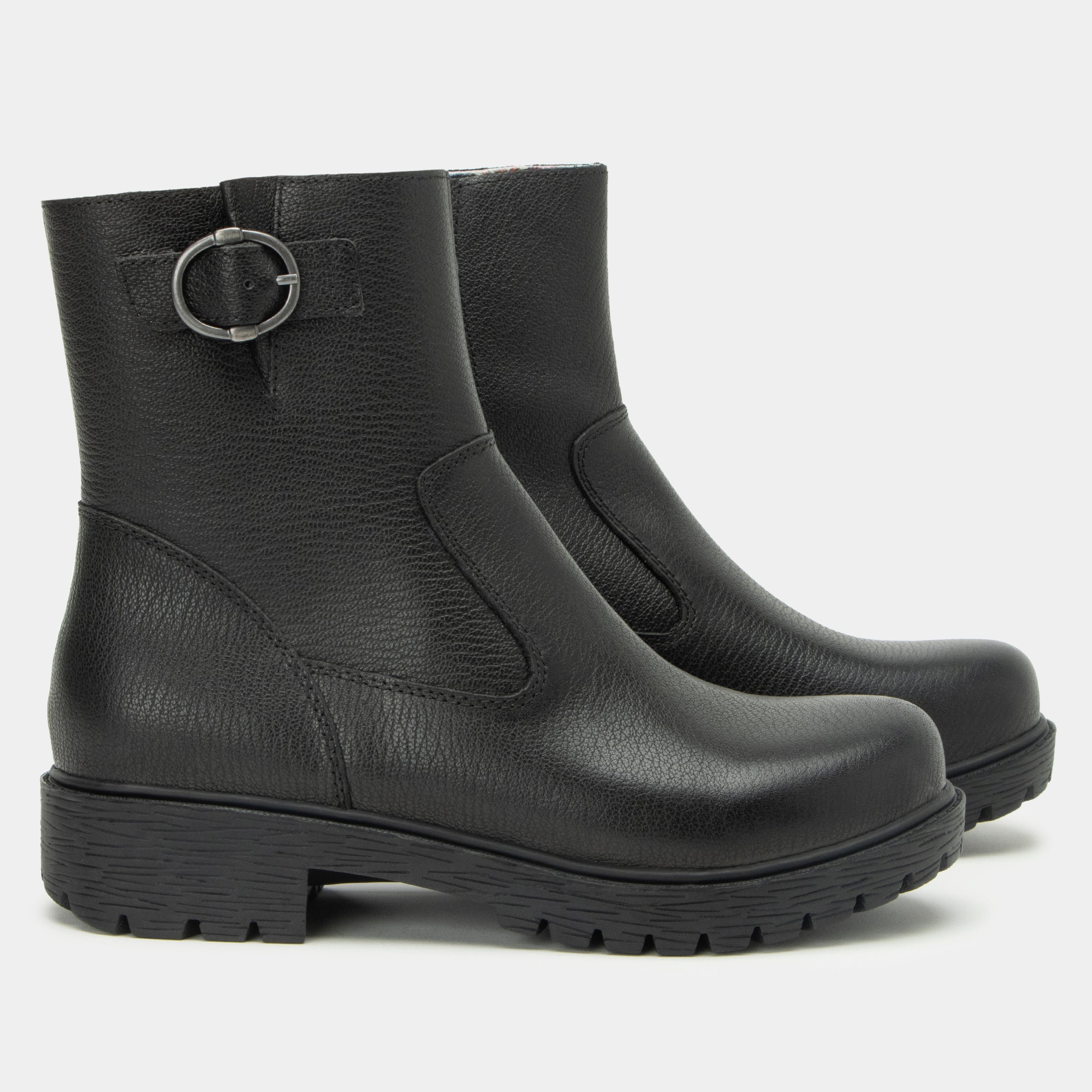 This sleek over-the-ankle leather boot on a slip-resistant luxe lug outsole calls for a pair of modern skinny jeans. It raises the comfort bar with a hidden inside zipper and adjustable buckle that allows for a roomier fit. Underfoot, there's a suede leather lined removable footbed made of polyurethane, cork and memory foam.