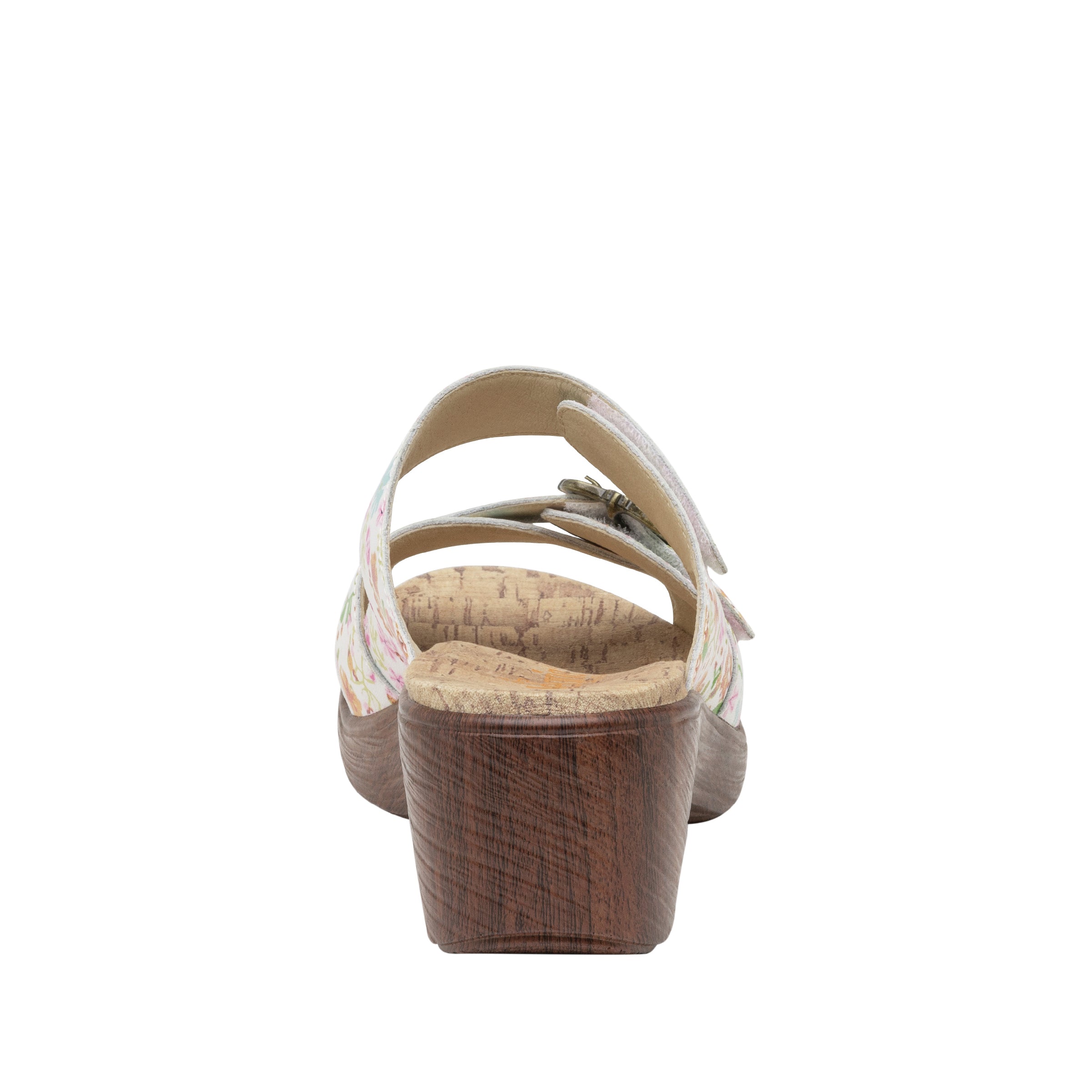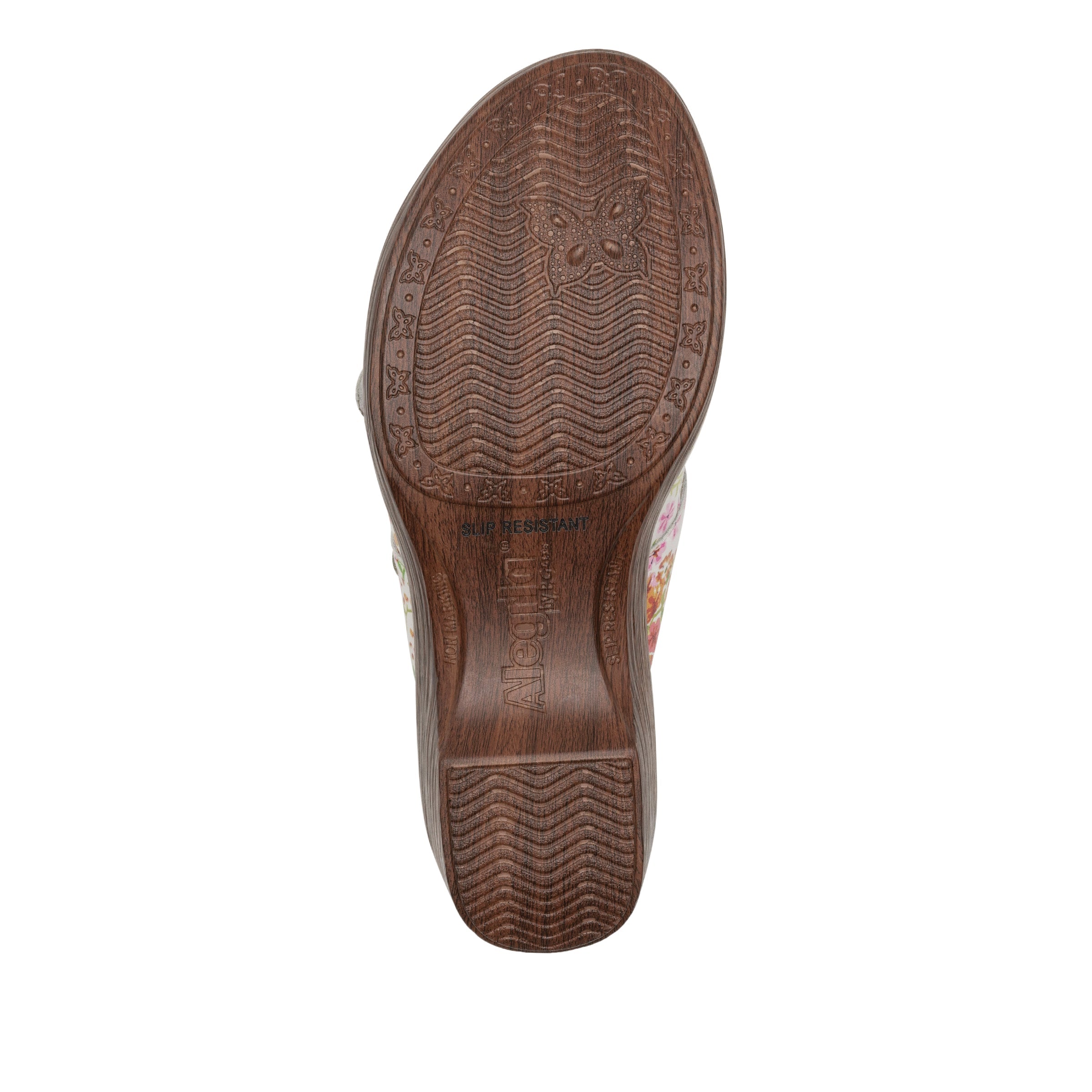 Featured in a floral printed Prime Time design on genuine leather upper. Take this sandal with you from day to night!