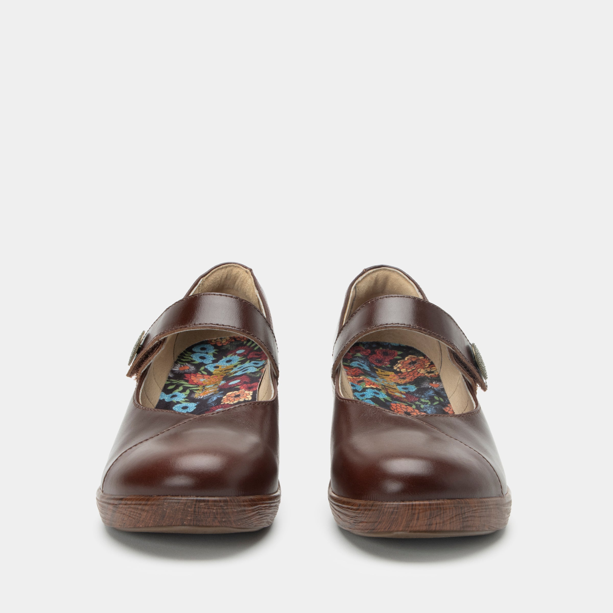 Mary Janes have matured in this grown-up leather version featuring a featherweight slip-resistant wood-look wedge bottom. Dressing it up is an adjustable hook-and-loop close strap with a decorative metal ornament. A printed microsuede-lined footbed made of polyurethane, cork and memory foam completes the ladylike story.