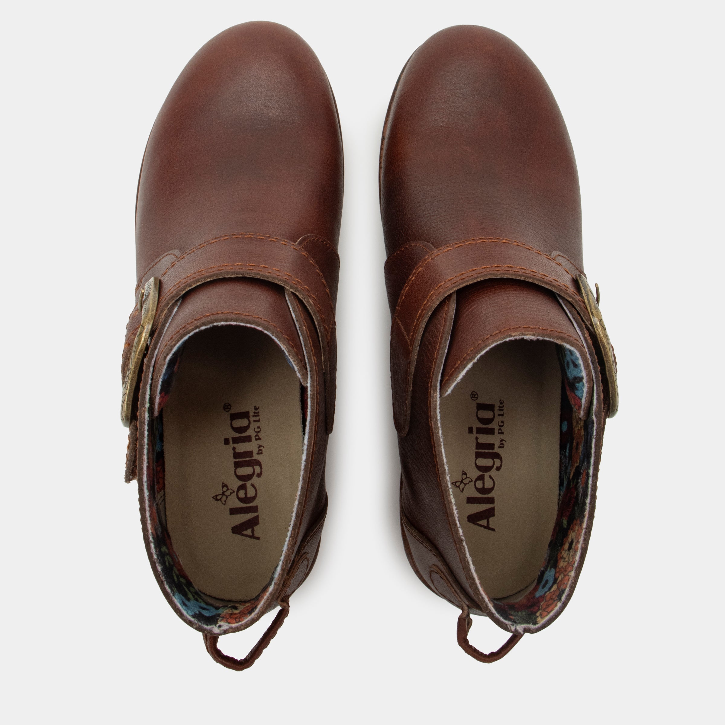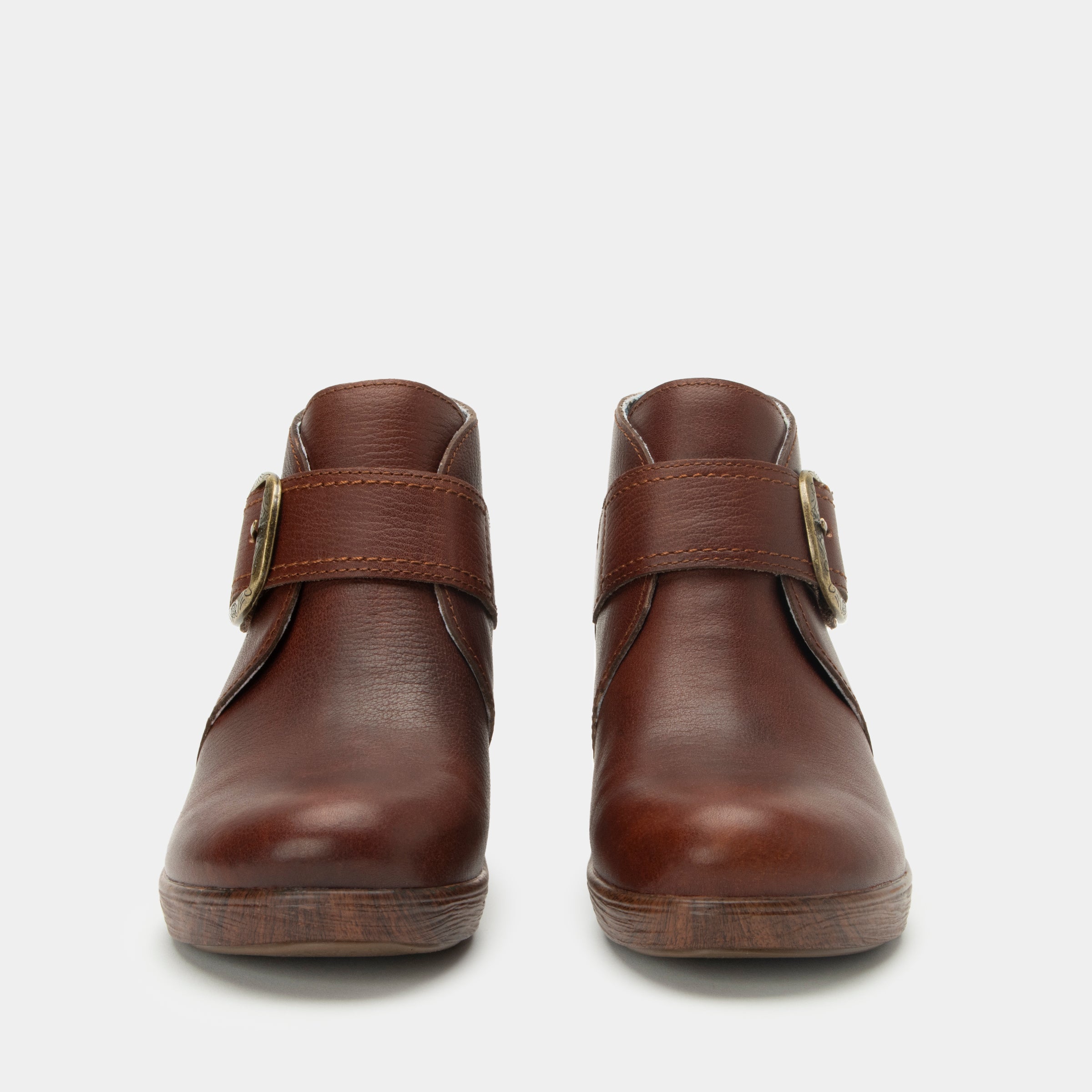 This leather ankle boot with a convenient back pull tab is detailed with a lightweight wood-look slip-resistant wedge. It features an adjustable hook-and-loop strap finished off with a bold metal buckle. The removable suede-lined footbed is made of polyurethane, cork and memory foam.
