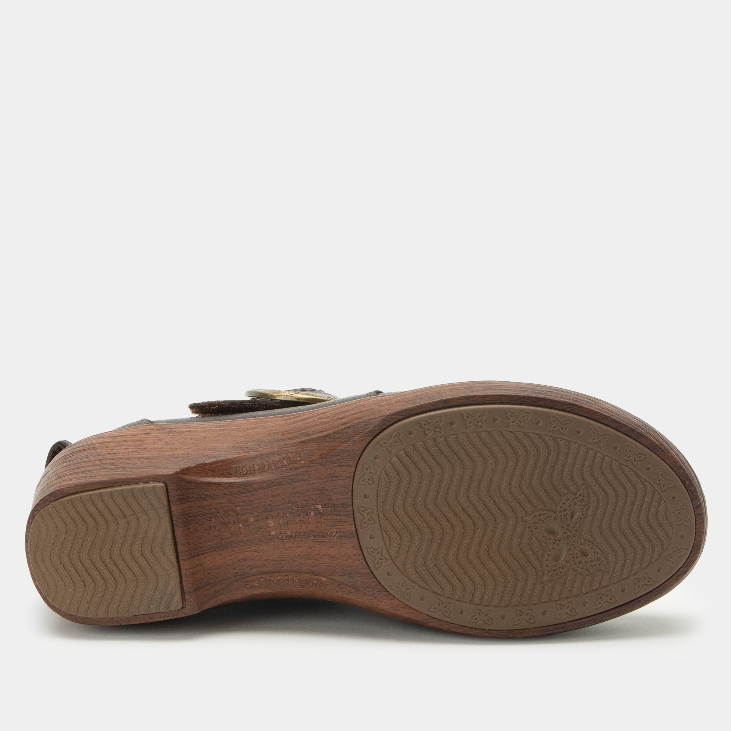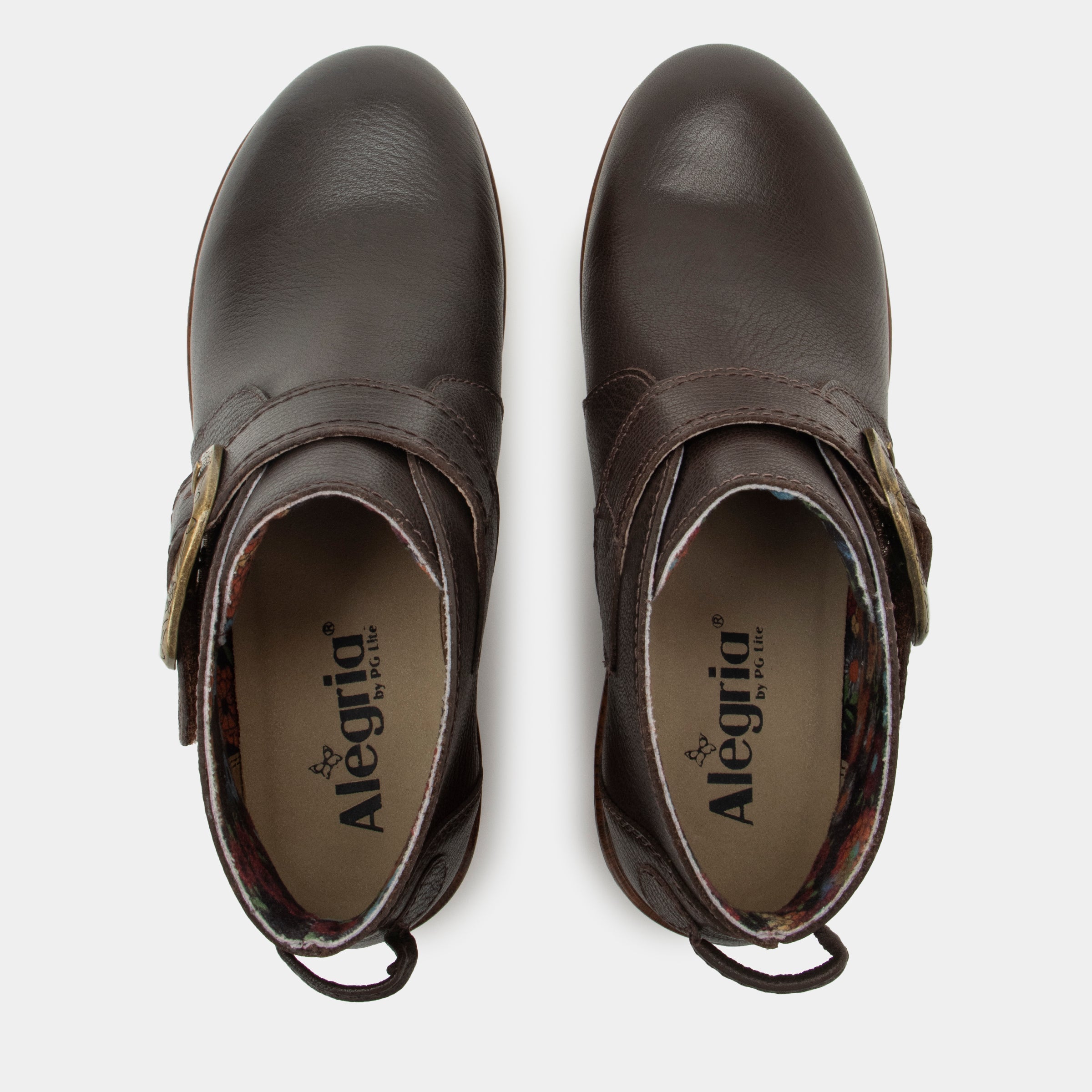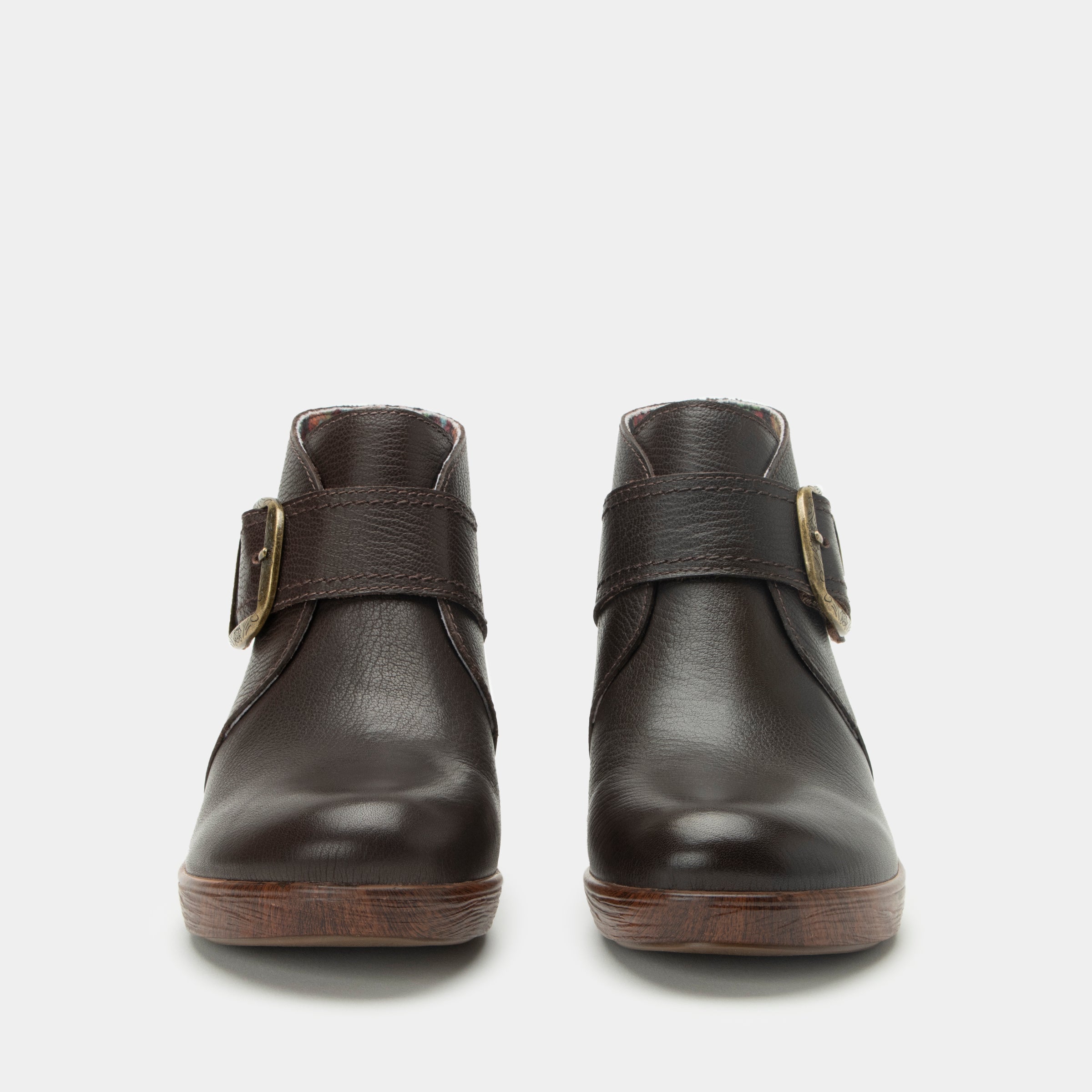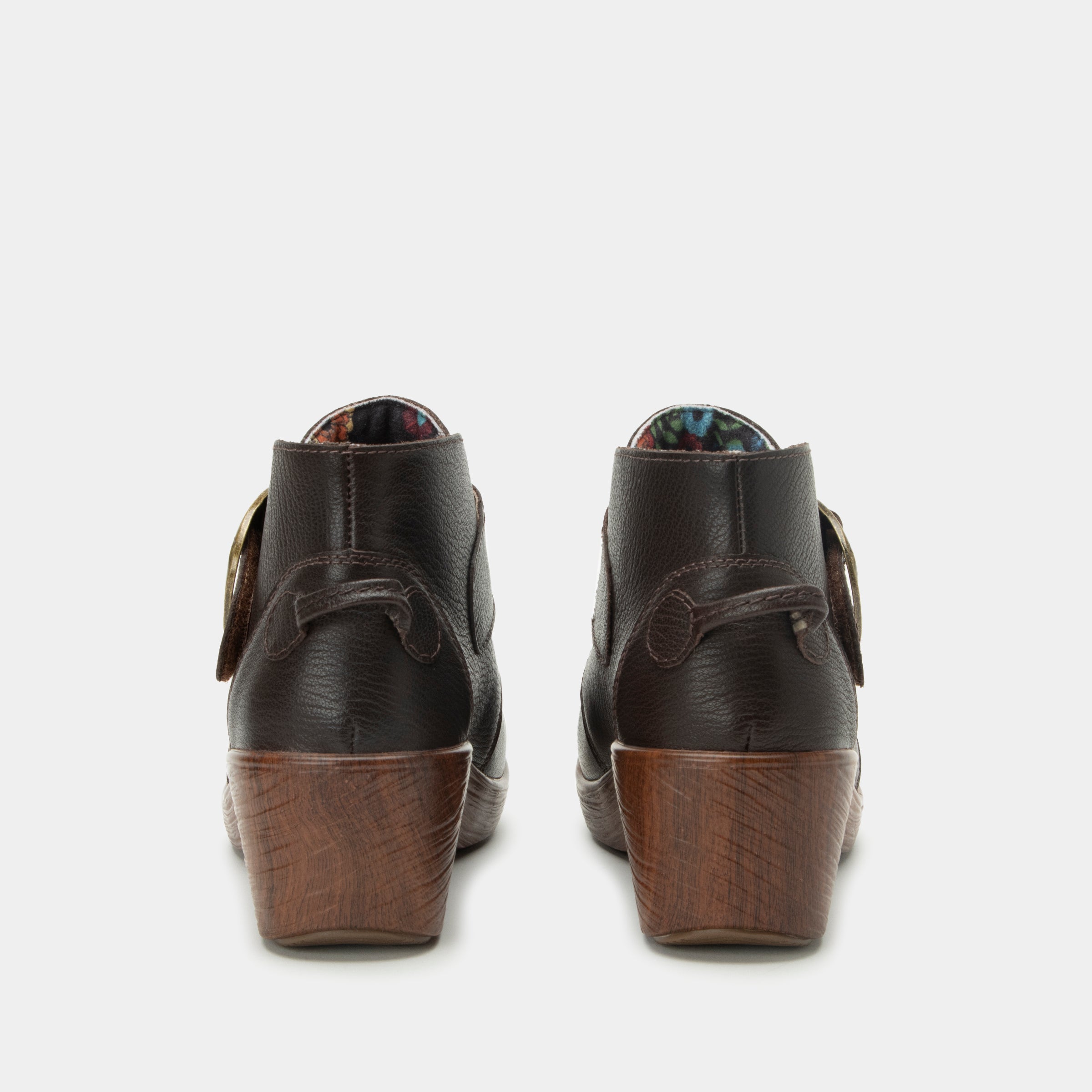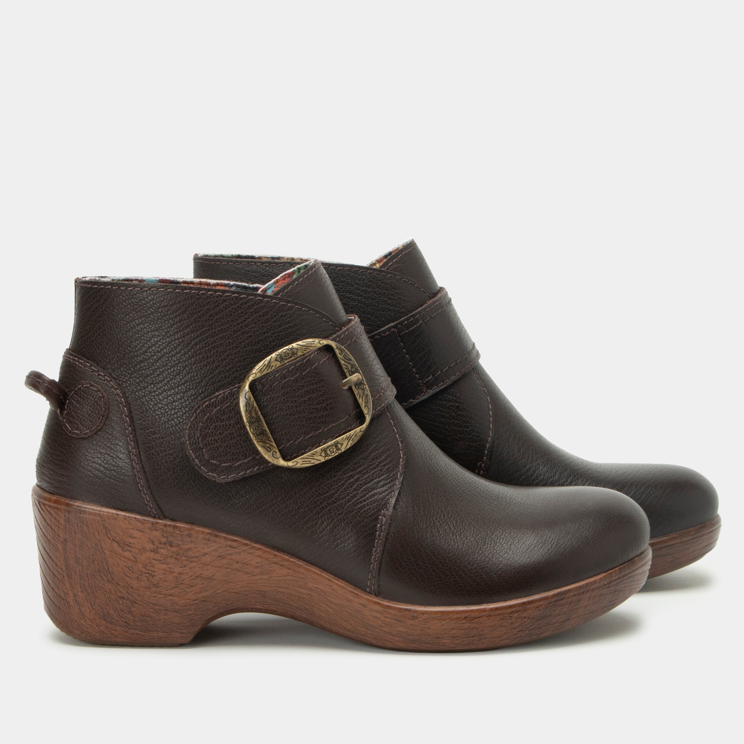 This leather ankle boot with a convenient back pull tab is detailed with a lightweight wood-look slip-resistant wedge. It features an adjustable hook-and-loop strap finished off with a bold metal buckle. The removable suede-lined footbed is made of polyurethane, cork and memory foam.