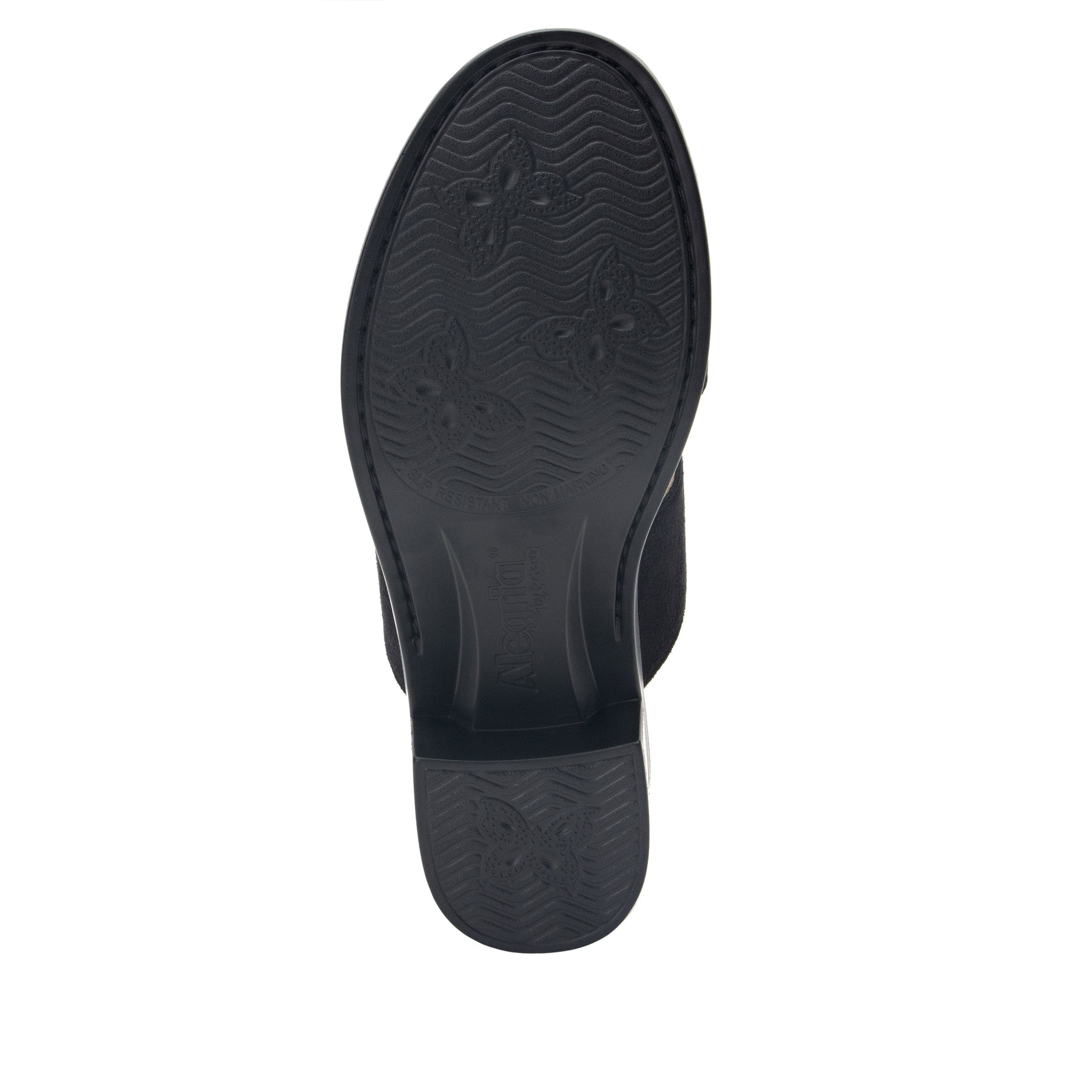 Featured in a timeless Black microsuede upper with matching microsuede footbed, detailed with a contrast top stitch.