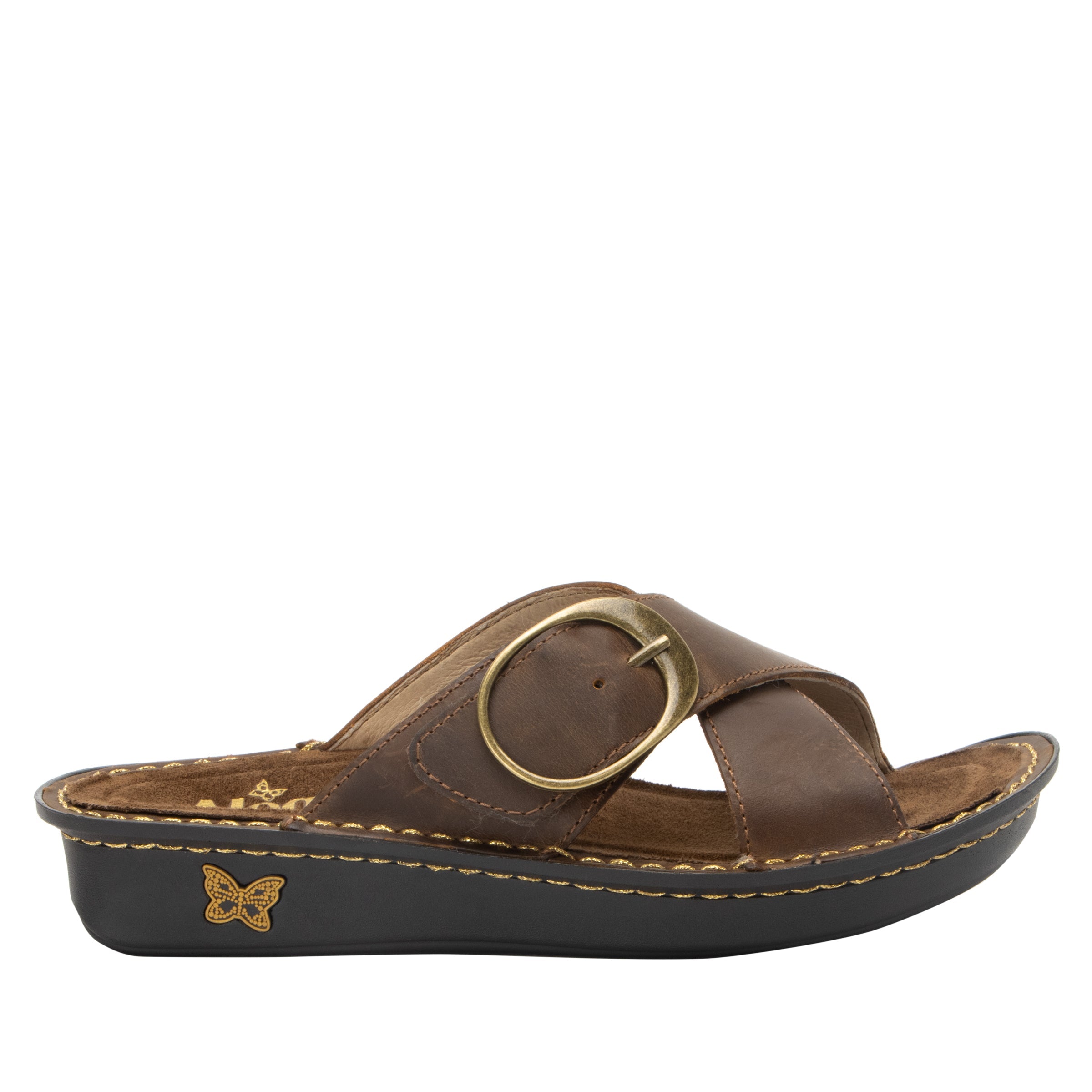 The classic crisscross sandal takes a bold step forward in this handstitched version with an ornamental buckle set on an adjustable hook-and-loop strap. A removable contoured footbed made of cork and memory foam, seamlessly fit into a mini outsole for walking ease. For added versatility, choose from uppers in textured calf hair or smooth leather.
