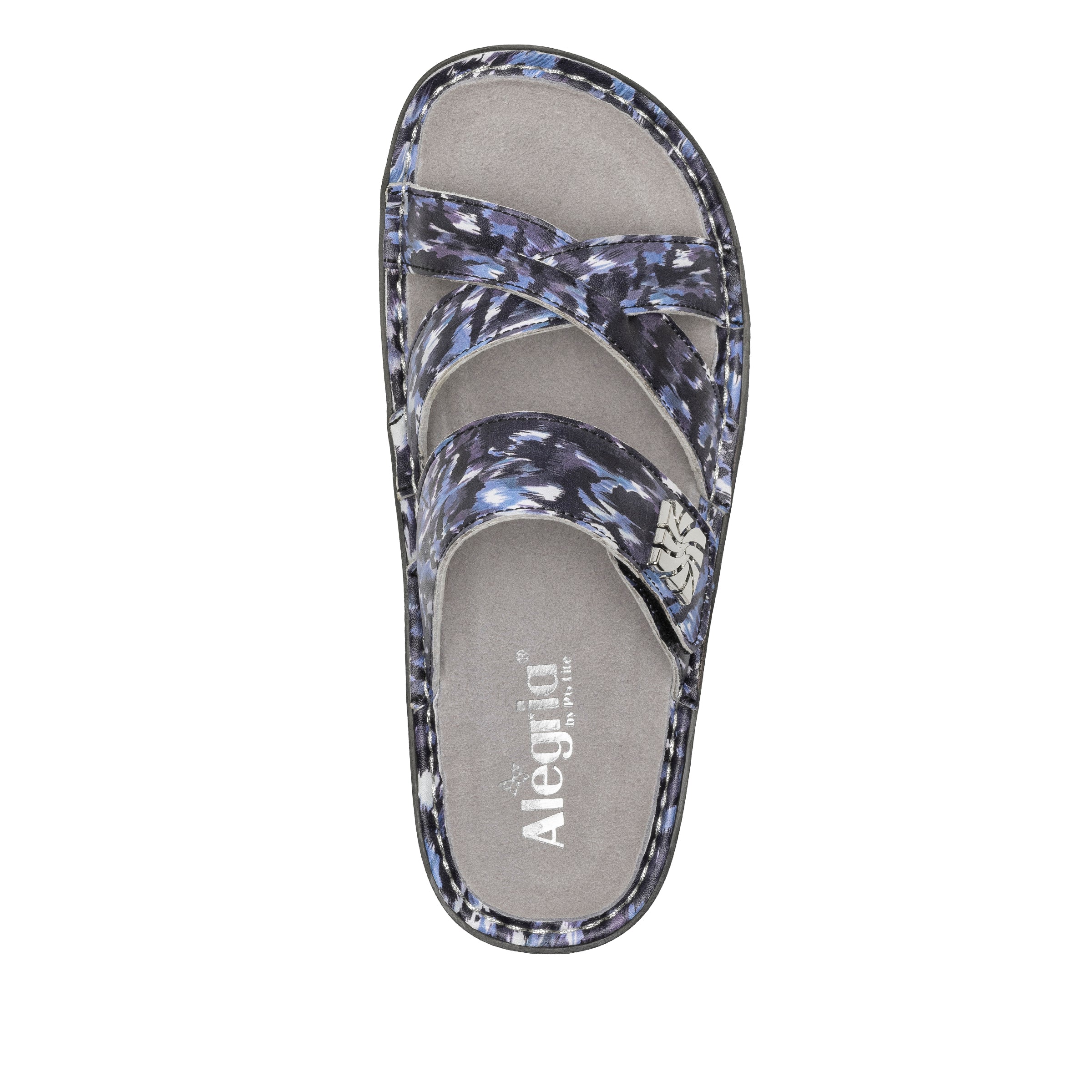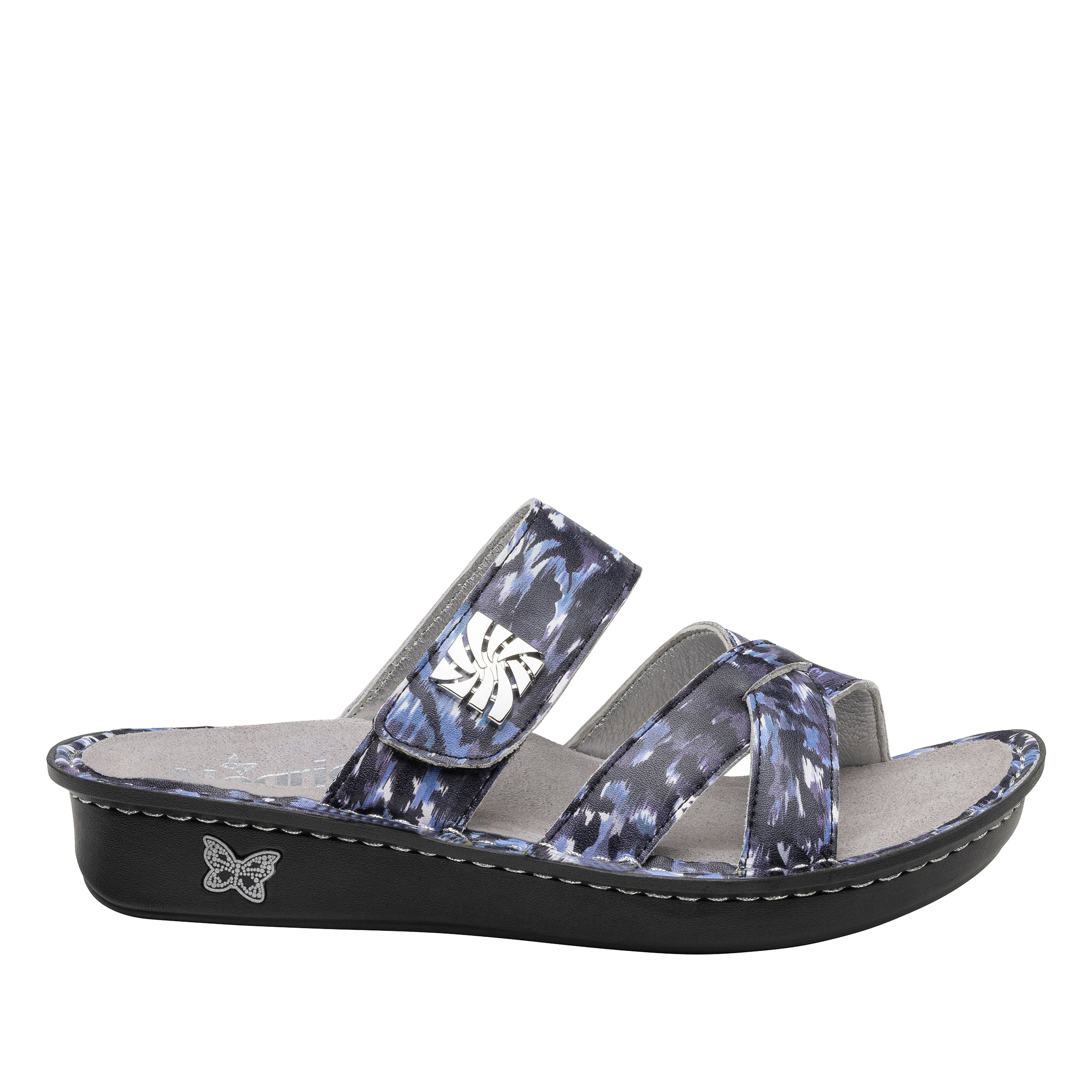 A crisscross slide with adjustable hook-and-loop leather instep strap takes a whimsical turn, trimmed with a novelty metal ornament. Underneath support and comfort is provided by a removable memory foam and cork footbed and mini outsole.
