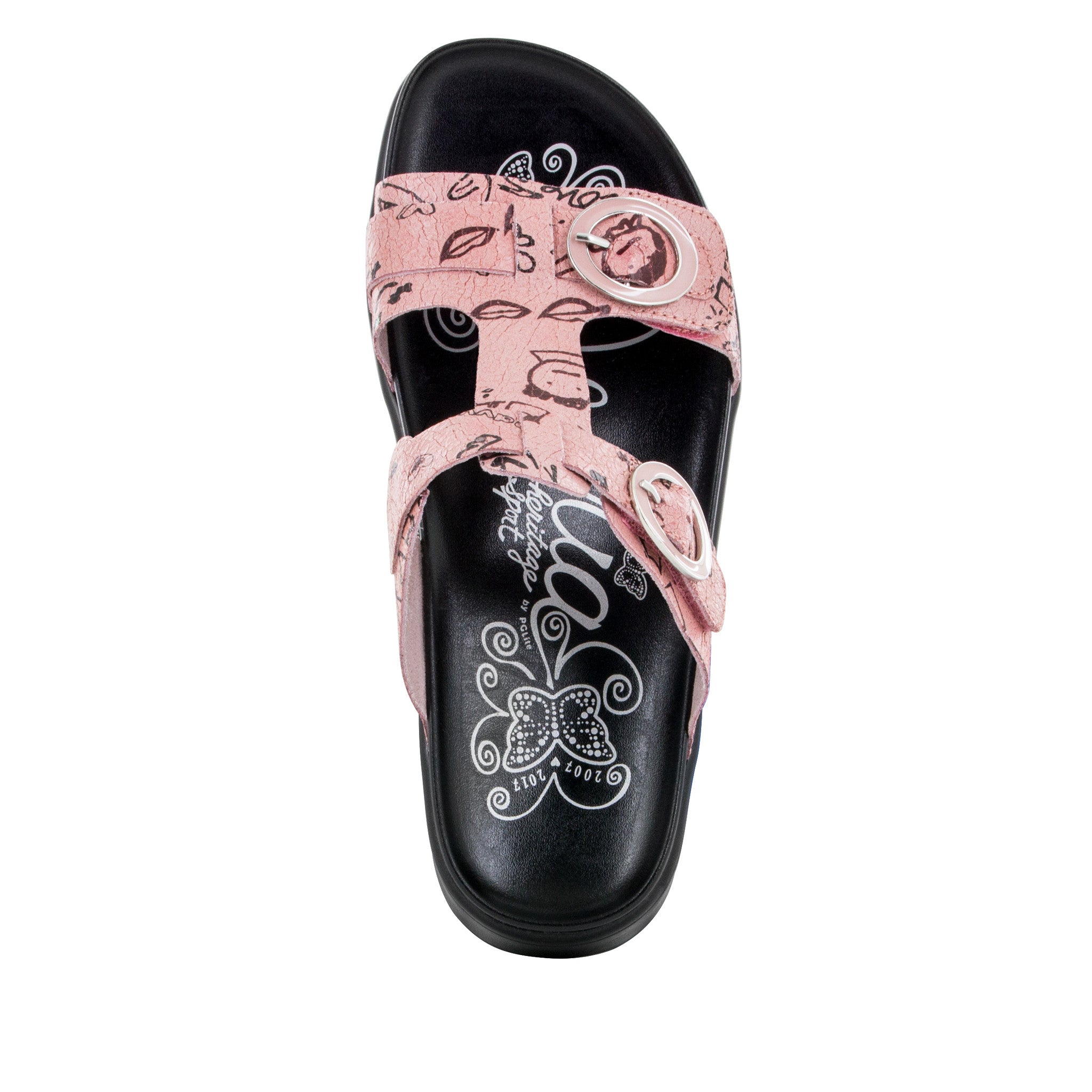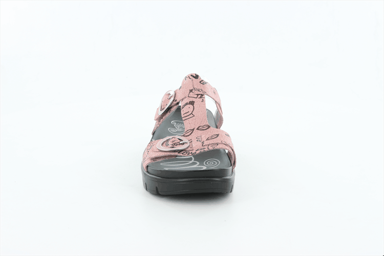 This two strap adjustable t-strap platform sandal is featured in a printed Red Scribble leather upper.